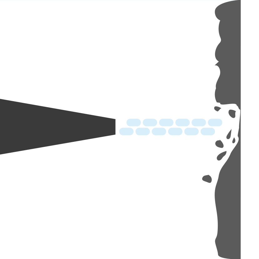 Compressed air pressure blasts dry ice pellets which sublimates on impact as carbon dioxide gas (CO2). Due to expansion, the contaminants are lifted and separated from the surface.