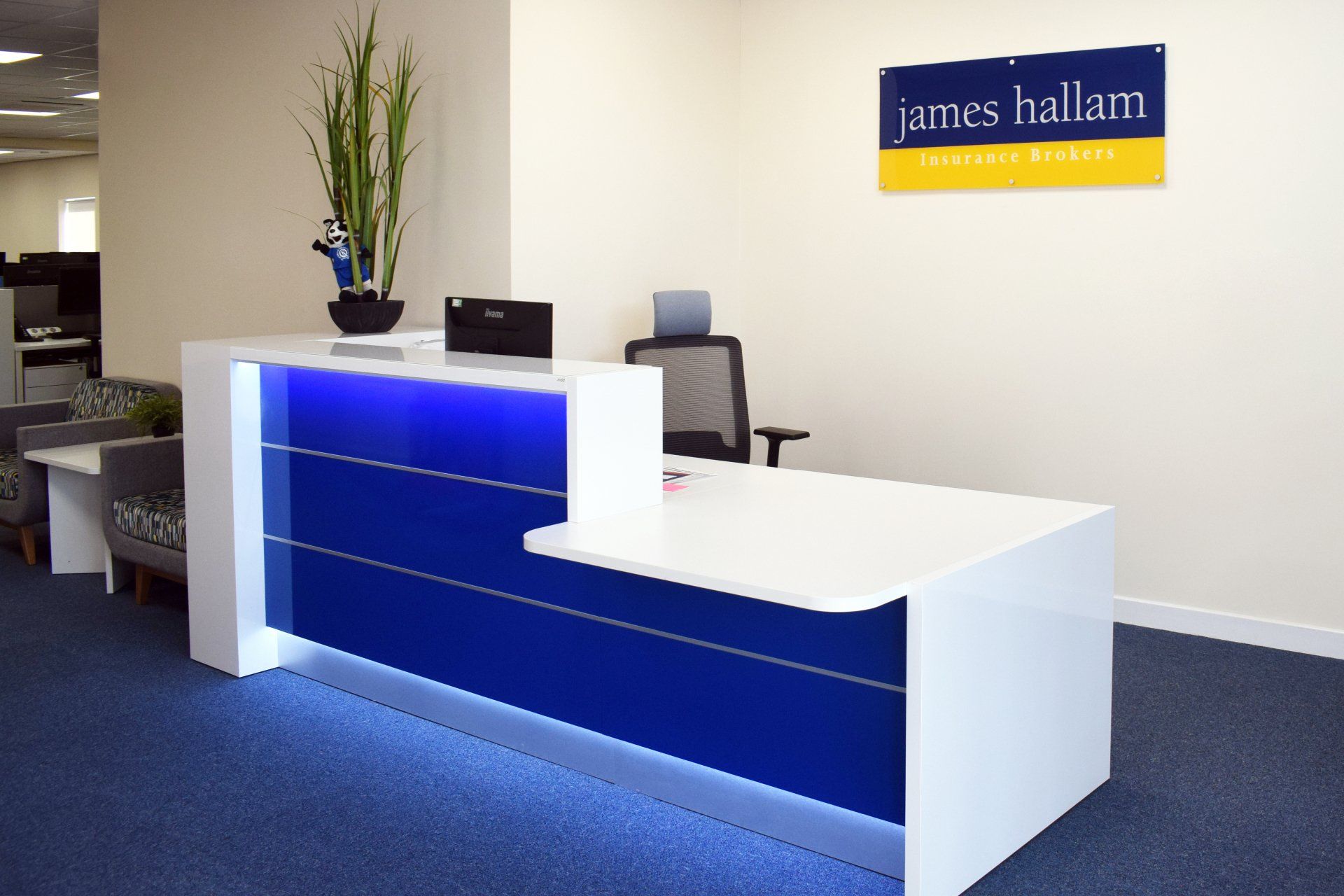 James Hallam Insurance Brokers required two large open plan spaces to achieve a number of different working environments - desk space, storage solutions, functional & varied breakout space along with client meeting rooms and a boardroom.